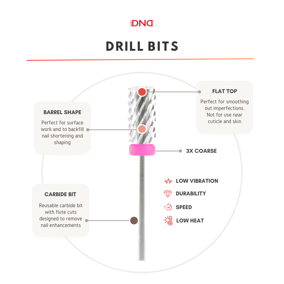 Built tough and engineered for ease, DND Large Barrel 3XC – Silver Carbide Drill Bit is a must-have tool for nail techs who work with gel, acrylic, or extension overlays. Its large barrel shape and aggressive 3X coarse flutes make it ideal for heavy-duty removal, reshaping, and prep work — perfect for cleaning up, shortening, and smoothing enhancements with speed and control.