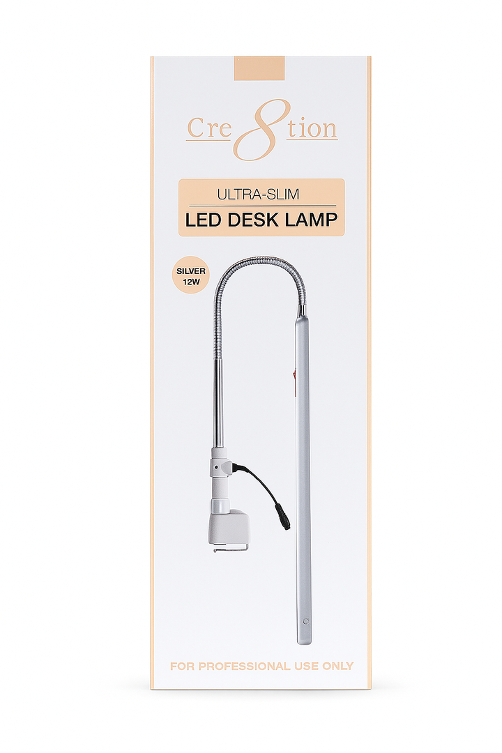 Illuminate your workspace with precision and style using the Cre8tion Ultra-Slim LED Desk Lamp. Designed for professional use, this sleek and space-saving lamp features a flexible gooseneck arm for easy angle adjustments and targeted lighting. The powerful 12W LED delivers bright, energy-efficient light ideal for detailed tasks such as manicures, pedicures, or desk work. Includes a secure clamp base for stability and a compact adapter for convenience.